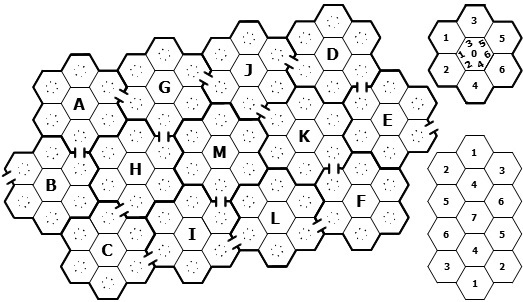 The encounters map for all chambers just comprises a mega- megahex, and can be laid out using a section of the Melee map from the free online download - also posted here: mle3ePx1.pdf. For a fuller description of hexwise scaling and subsection representation in use here, check out the Black Auger mapping notes: bagG3.html.